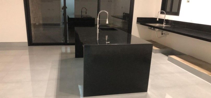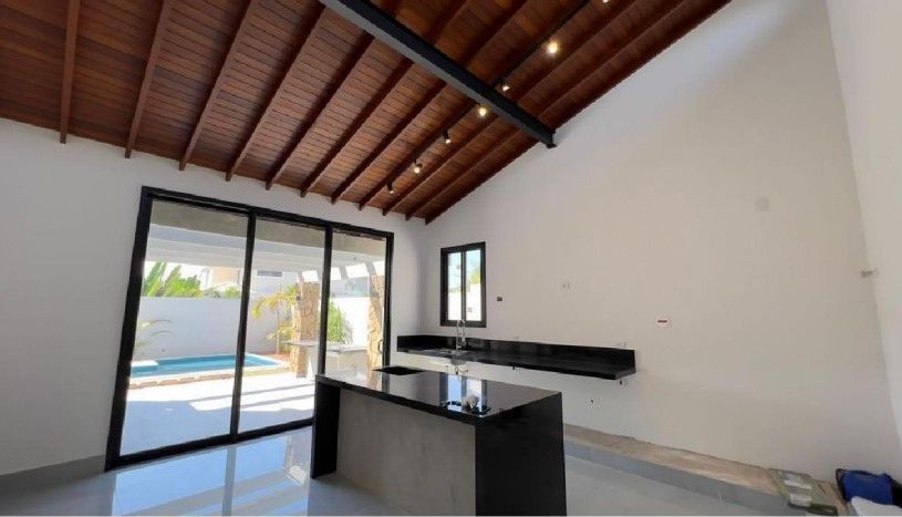 Lavabo, ideal para visitantes, cozinha Gourmet com pé-direito alto, perfeita para quem aprecia gastronomia, despensa e lavanderia (área de serviço), área de lazer integrada à cozinha, com pergolado em concreto aparente, espaço para churrasqueira e convivência e garagem para 3 carros com pergolado em estrutura metálica.